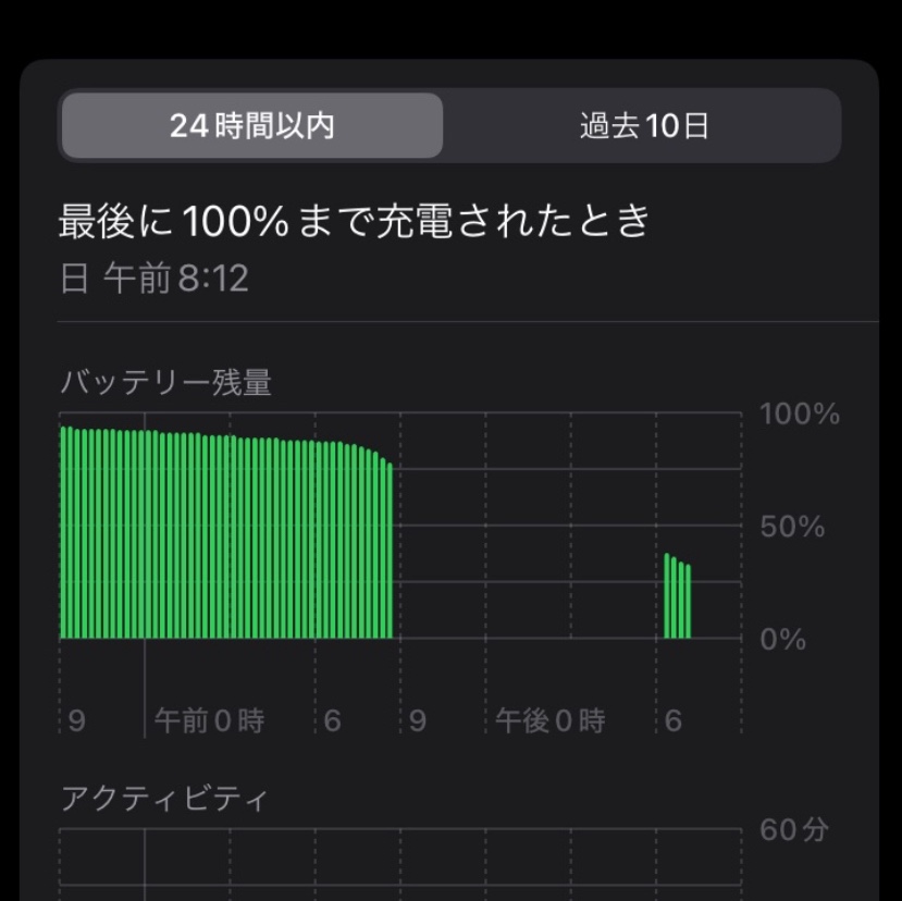 急激に減ったといっても、グラフに示されてるのは前日の午前8時に100%まで充電して、翌日の午後6時に30%程度になったというものですか?それとも、グラフが切れてますけど、100%にしたのはその日の午前8時?
