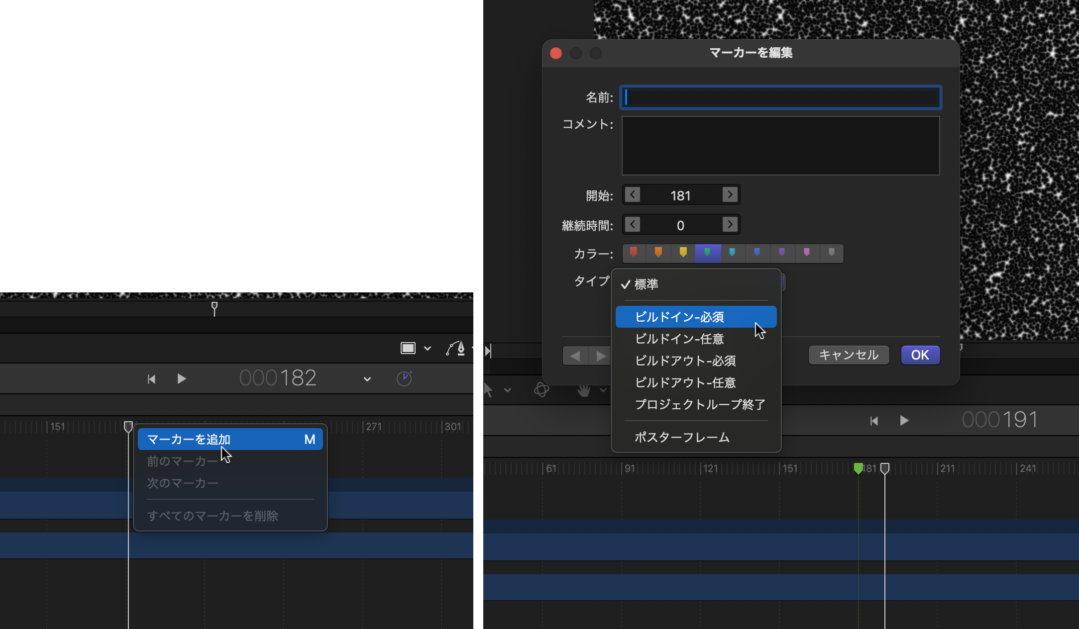 マーカーは、タイムラインの何もないところをクリックして何も選択していない状態でタイムラインをアクティブにしてMキーを押すか、再生ヘッドのつまみ部分を右クリックしてマーカーを追加で。