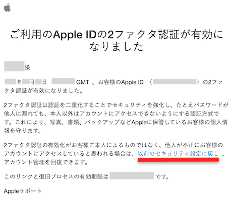 上記条件に該当される方が2ファクタ認証を取り止めるには、移行直後にAppleから届く移行確認メールを使います。添付画像のごときメールの中に、以前の方法の戻すためのリンクがあります。認証方法は、以前のセキュリティ質問方式に戻ります。