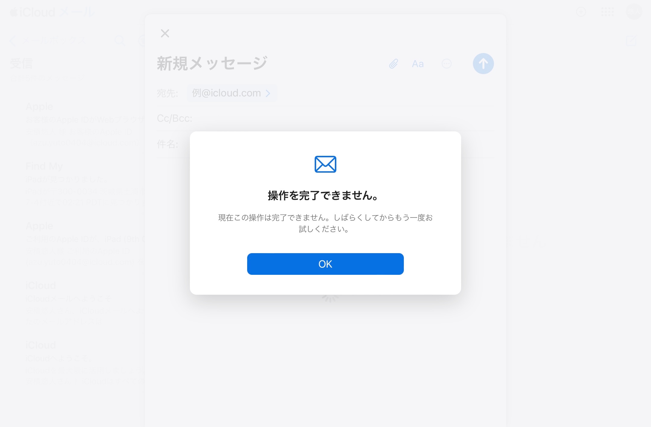 Web版icloudメールを利用しているのですが、作成中にエラーが出て、メールの返信などができません。