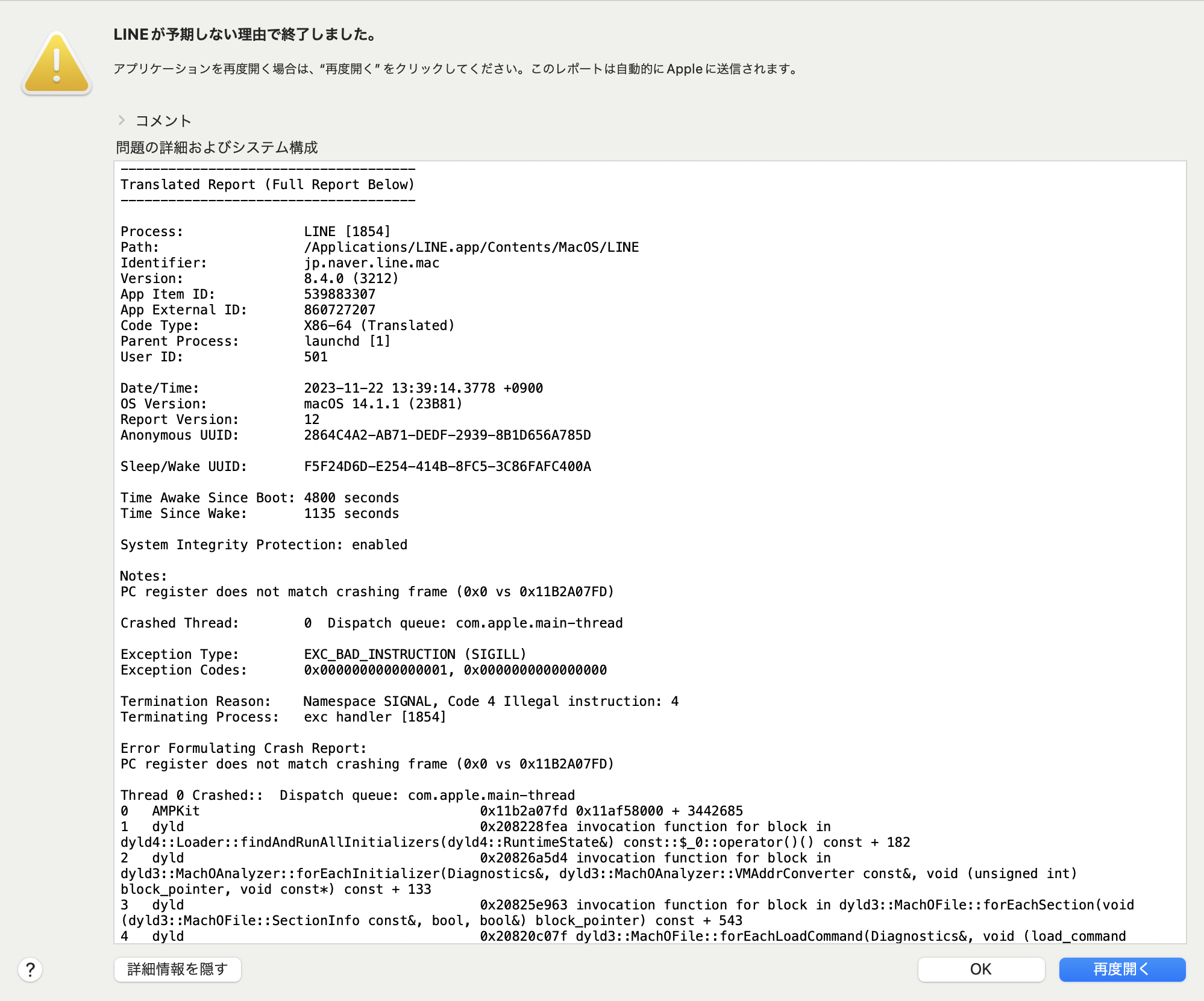 ここ2,3ほど前からおそらく出現していたのでもしかしたらOS venturaが原因でない可能性がありますのでご了承ください.長文をうつときはパソコンのほうが便利なのでMACにapp storeからLINEをダウンロードし使用していましたが(ver 8.4.0.3212),何ヶ月か前からLINEを始めるときに下記コメントが出現するようになっていました.再度開くをおすと利用はできますがこのコメントがでないようにする解決策があればお願い致します