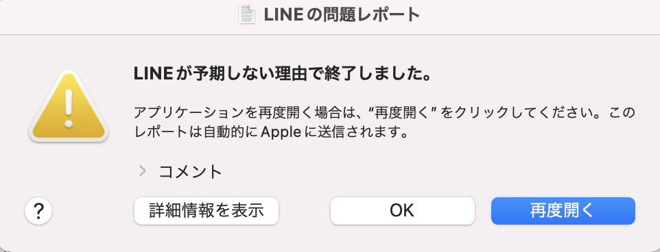 MAC版LINEを開くときに(LINEが予期しない理由で終了しました)とコメントがでる.