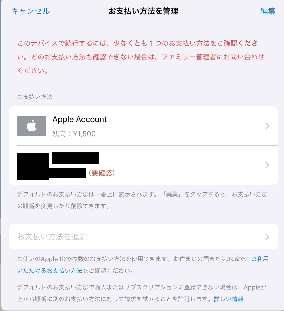 課金する時に「このデバイスで続行するには少なくとも1つのお支払い方法をご確認ください」と表示されます。