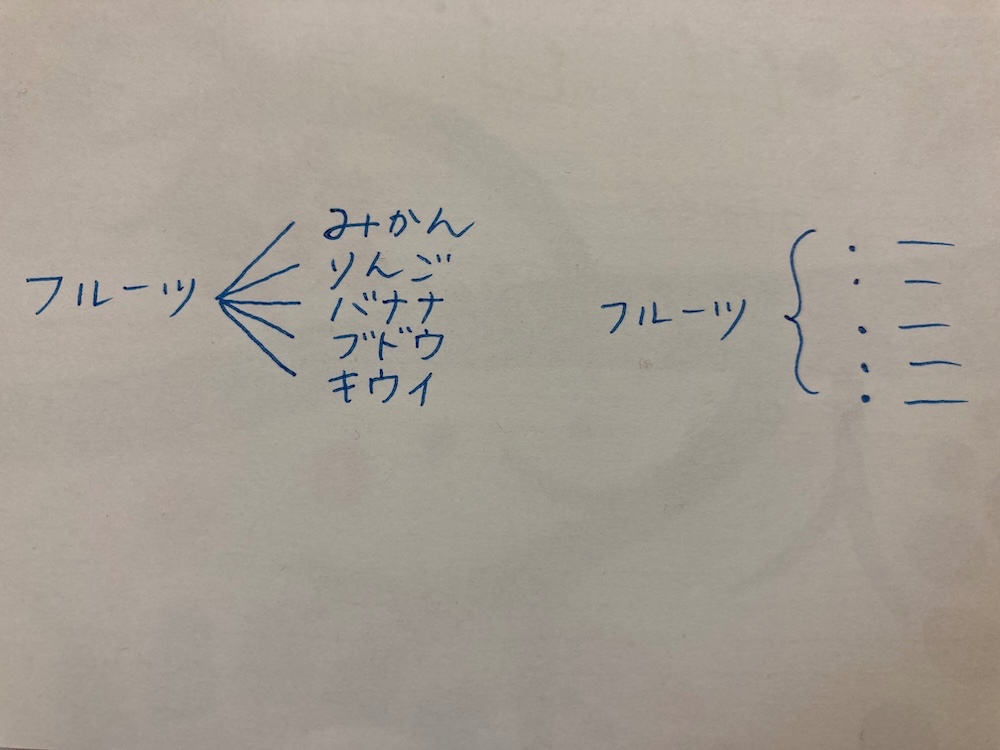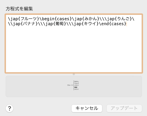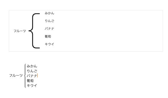 \jap{フルーツ}\begin{cases}\jap{みかん}\\\jap{りんご}\\\jap{バナナ}\\\jap{葡萄}\\\jap{キウイ}\end{cases}
