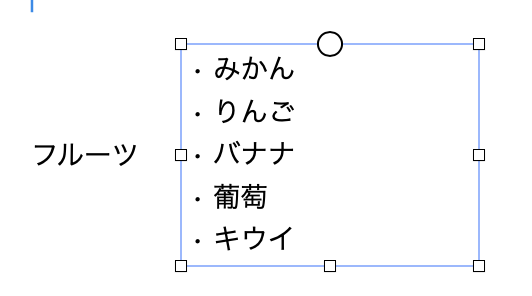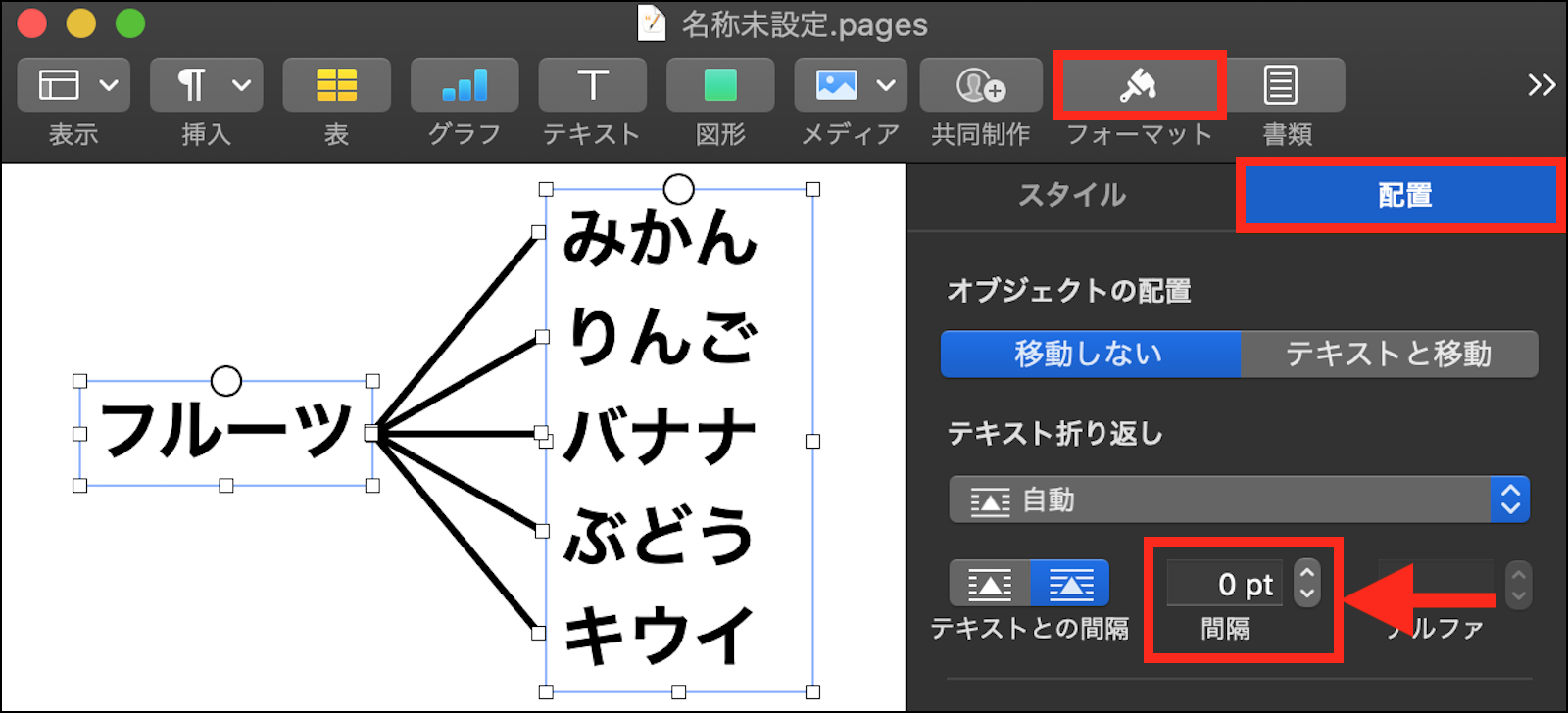 119104 さんが添付して下さった画像左側の放射状に分岐する場合は、下の画像の様にフルーツとその内容はテキストボックスで入力し、放射状分岐は「図形」>「基本」>「線」を角度と長さを変えて配置しますが、その前に 各オブジェクトを各々選択した状態で、「フォーマット」インスペクタ >「配置」タブ >「間隔」の設定を「0 pt」に設定 して置いて下さい。