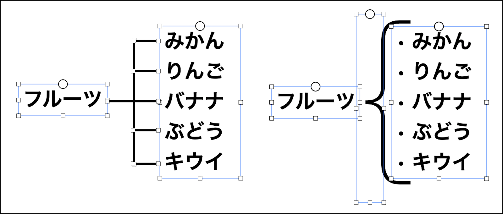 また、下の画像右側は、119104 さんが添付して下さった画像右側の、箇条書きにした内容を左中括弧で閉じる場合ですが、左中括弧もテキストボックスで入力(使用するフォントは「ヒラギノ角ゴシック(W0)」)し、フォントサイズで大きさを調整していますので、余り箇条書きにする項目が多いと、「W0」とは言え、テキストとの比較でフォントの太さに違和感が生じます。
