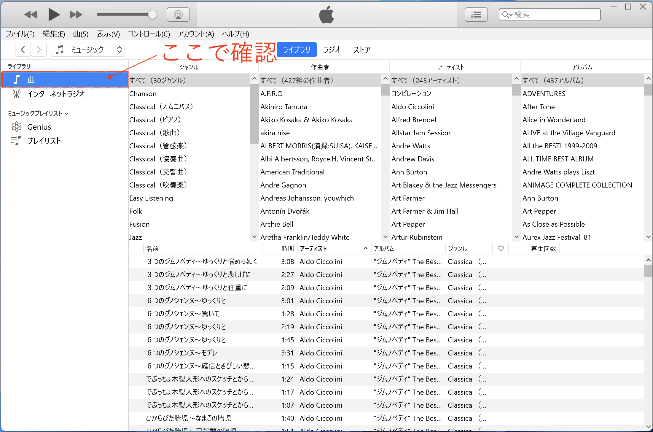 サイドバーの「ライブラリ」のところ(今は「インターネットラジオ」しか表示されていないところ)に「曲」という項目を表示させてそこを選択して確認するということです。その方法はご存知ですよね。