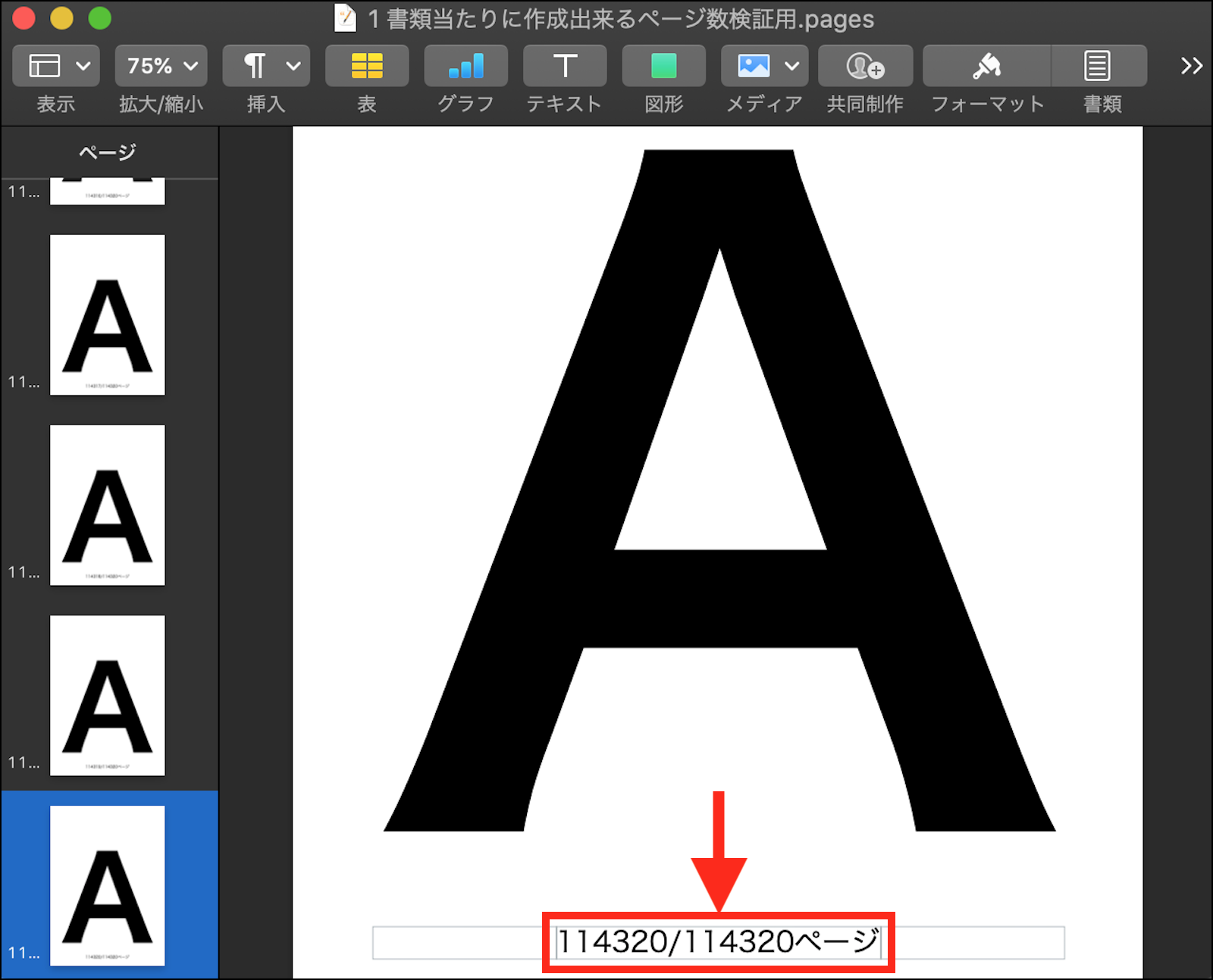 「Pages」の書類が保存されているストレージ(Mac や外付けストレージ、iCloud ストレージ等)の空き容量には当然制限を受けますが、取り敢えず下の画像の様に、1 書類当たり 11 万ページ以上作成出来る(まだまだ行けそうですが、さすがに疲れましたので、これ以上はちょっと・・・)事は確認出来ましたので、おそらく 1 書類当たりに作成出来るページ数に制限は無い のではないかと思います。