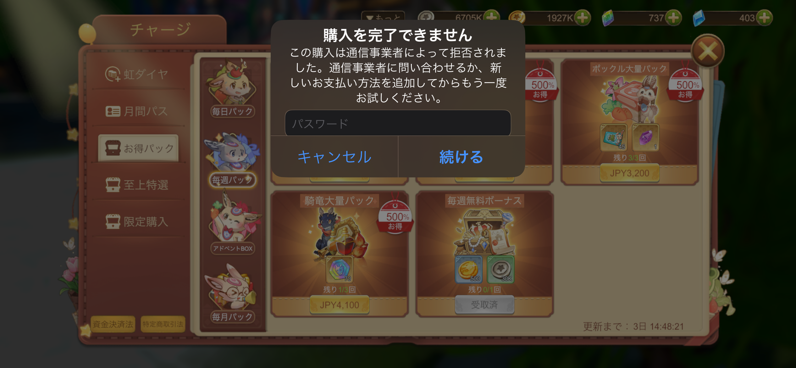 クレカで買ってたらこれが出たので、iTunesカードを買ってきて3万程追加したのですがずっとこれが出て決算できません!悲しいです!