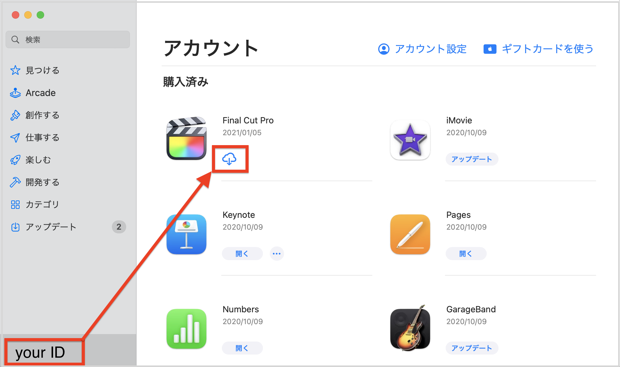 2. FCP10.7のアップデートは、macOS Ventura13.5以降が対象です、古いOSは更新不可。AppStoreを開き、FCPを購入したApple IDでログイン →左下の名前をクリック →ダウンロード可能な場合は雲マークが表示され、OSに合った最新バージョンを入手可能。*雲マークが無い場合は、古いOSなので更新不可