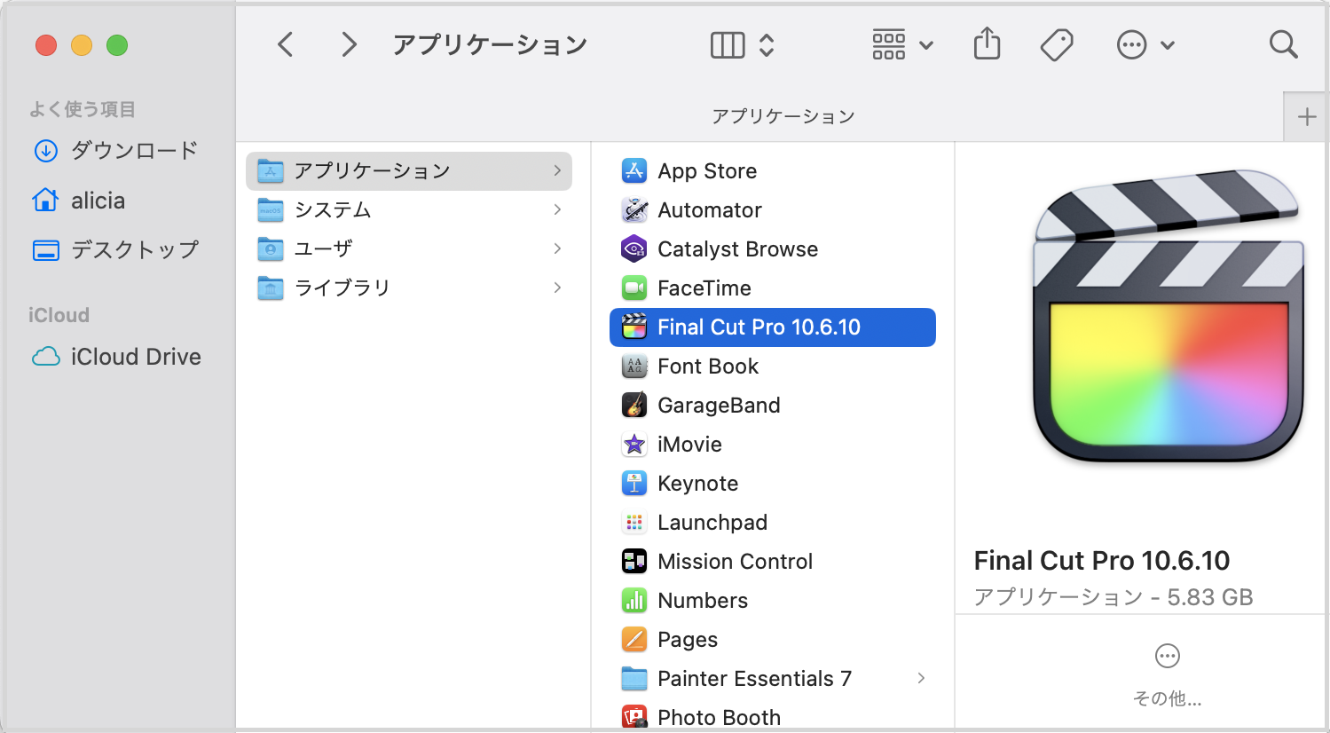 ・2.のとおり、AppStoreで最新バージョンをダウンロード →[Final Cut Pro 10.7]にアイコン名称変更 →パスワード認証