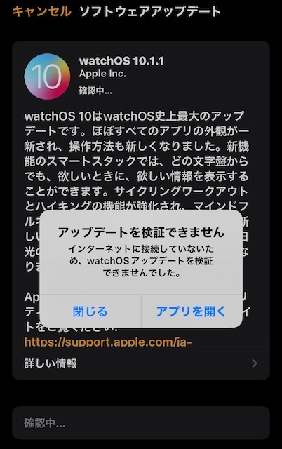 「アップデートを検証できません インターネットに接続していないため、アップデートを検証できません」と表示され、watch os10.1.1にアップデートできなかったため