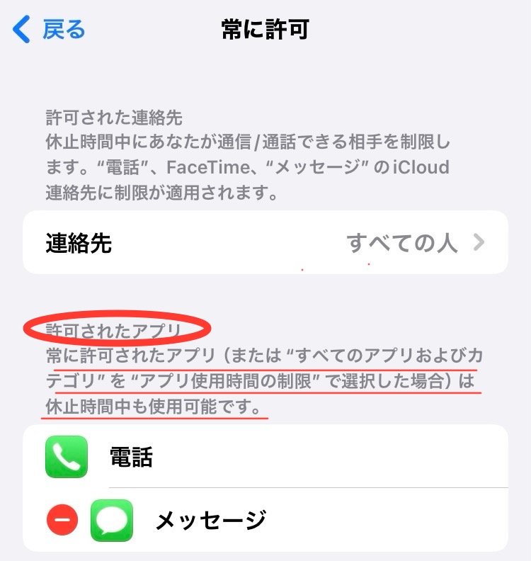 例:毎日22時〜7時のあいだ、「常に許可」の設定で許可したアプリ(メッセージ)と通話のみが使用可能。