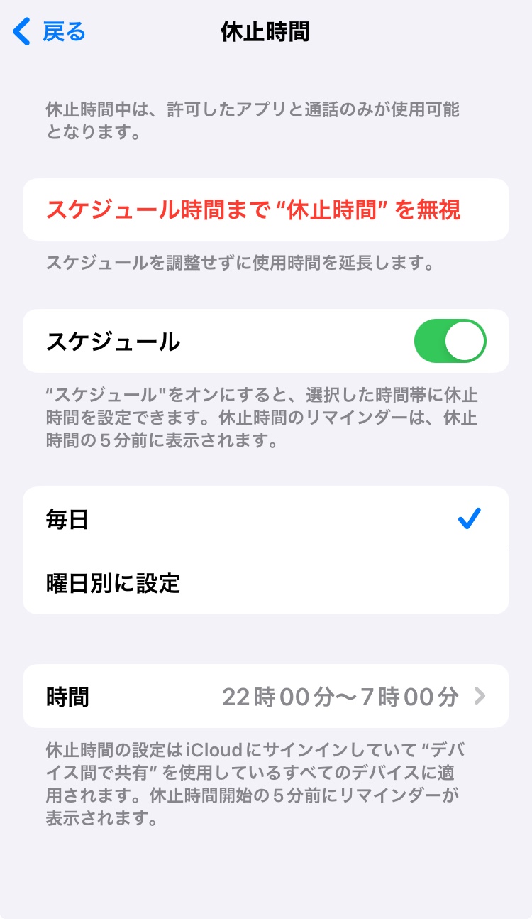 他のアプリ(App Store、FaceTime等)は休止時間中使用不可。