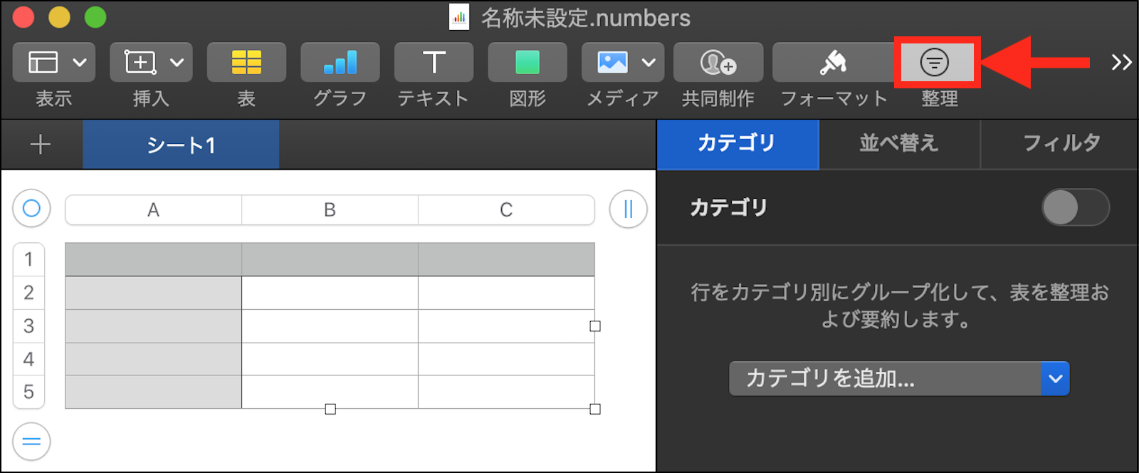 「整理」インスペクタが表示されている状態ですので、下の画像の様に ツールバーの「整理」インスペクタボタンをクリック するか、