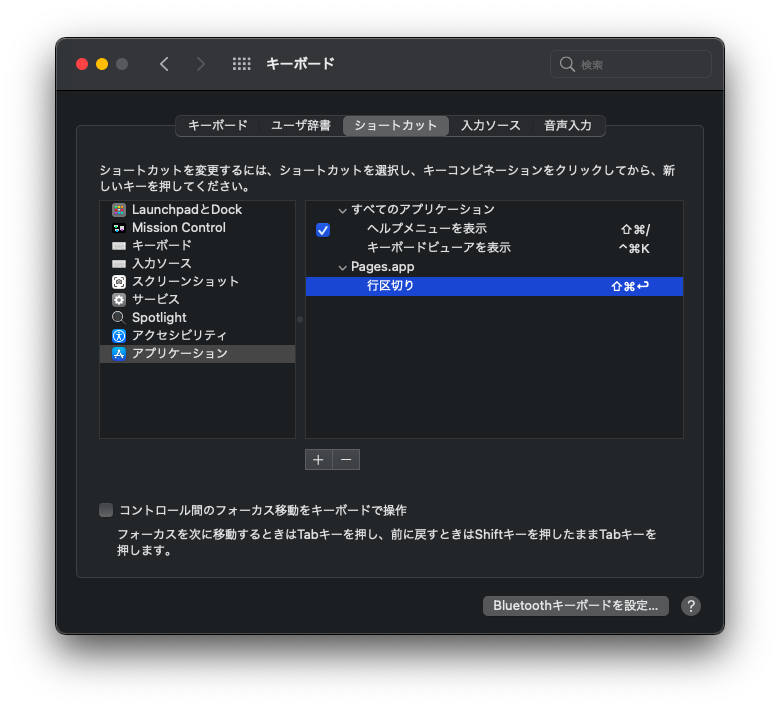 キーボードショートカットの方で追加してみようと思ったのですが、「キーを選択」?ができなくて断念しました。他のアプリで試してみるとできたのですが。。