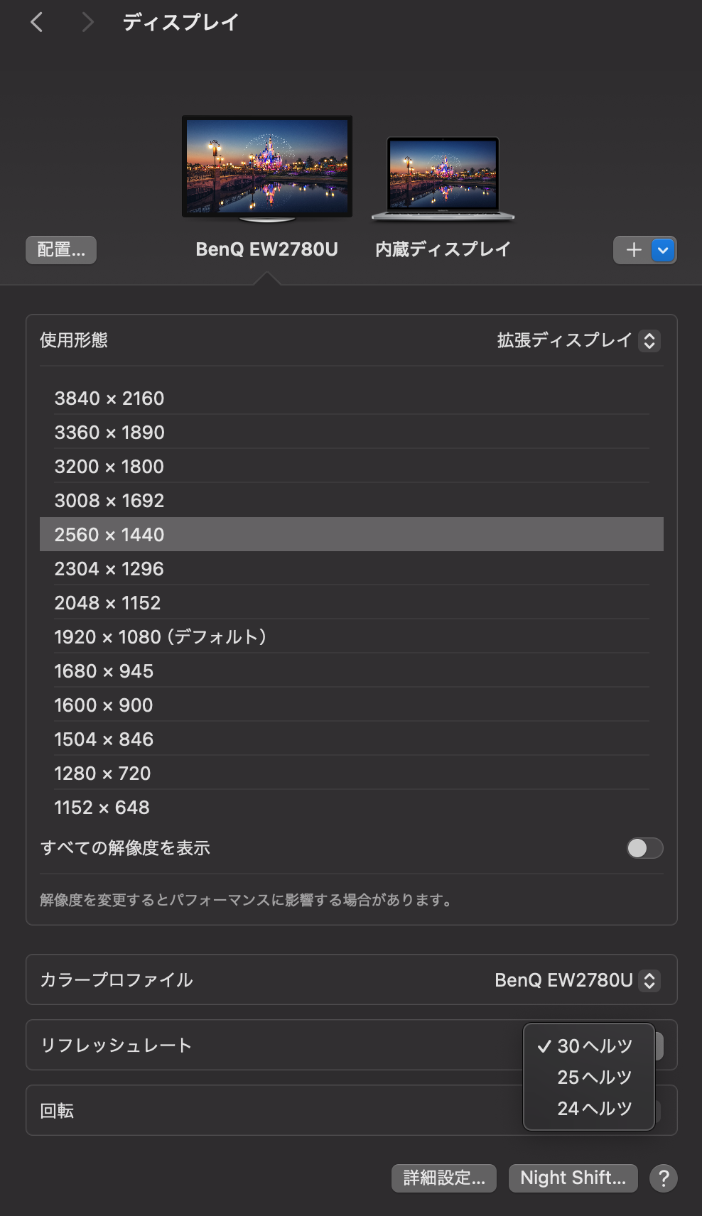 Sonomaにアップデートしたら、外部ディスプレイのリフレッシュレートが30Hzまでしか選べなくなった