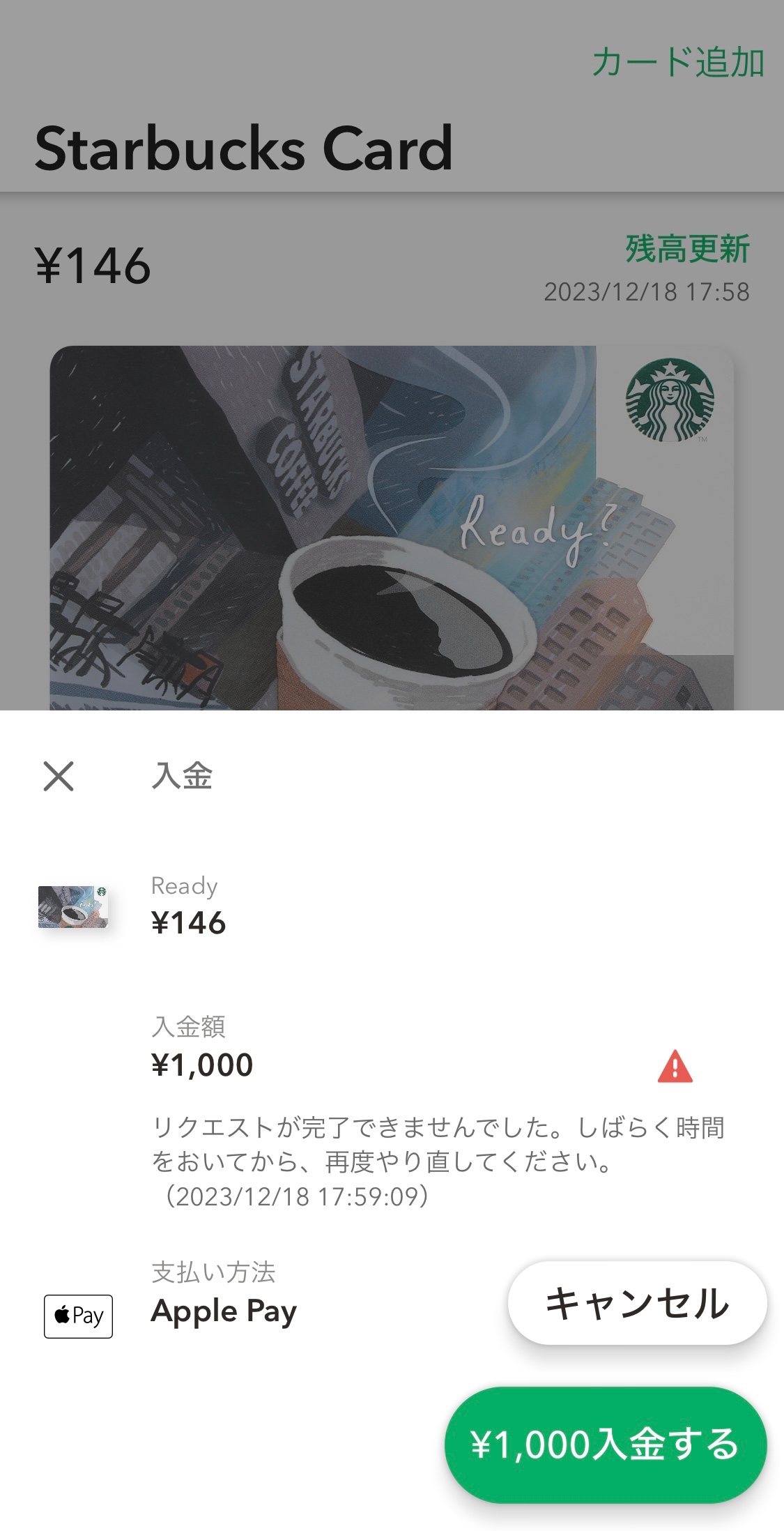 Starbucksアプリからの入金で、ApplePayによる支払いを行うと、「リクエストが完了できませんでした。」と表示され、支払いができません。