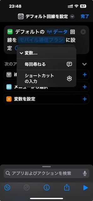 ショートカットの「デフォルトの回線を設定」でモバイル通信プランの変数の選択肢にSIMの情報が出ない