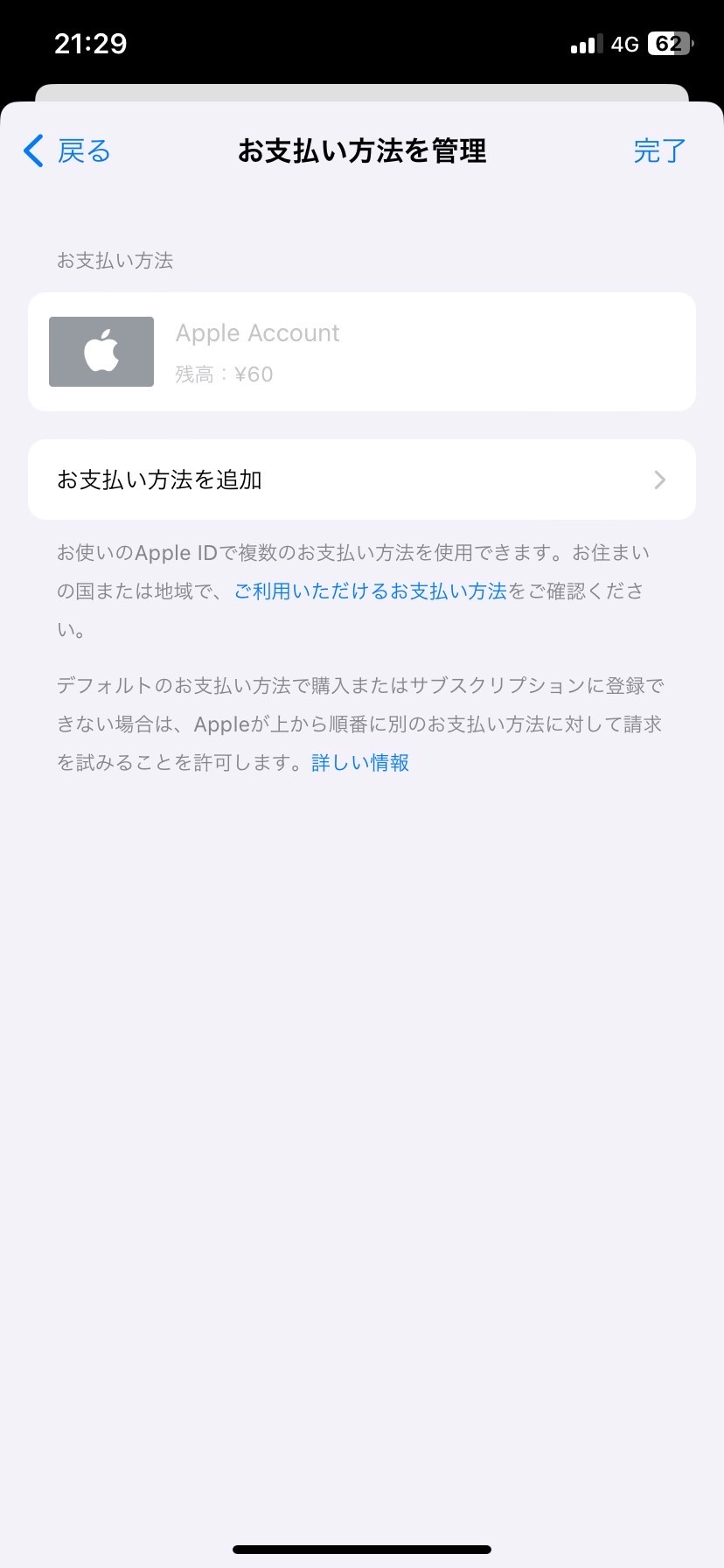 (Apple アカウントの残高が無い場合は、Apple アカウントの項目は表示されません)