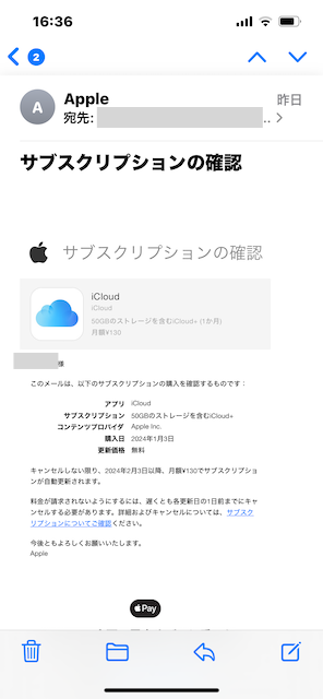 50GBのストレージを使い続ける場合は、何もする必要はありませんが、お支払い方法にキャリア決済とかクレジットカードが登録されていることを確認してください。何も登録されていない場合は、Apple IDにチャージしておく必要があります(Apple IDからの支払いをメインにする場合は、残高が不足しないように気をつけてください)。