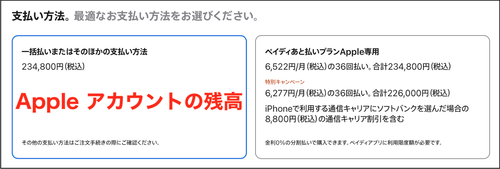 残念ながら、ペイディあと払いプラン Apple 専用は、下の画像の様に他の「お支払い方法」と同時に選択出来ません ので、Apple アカウントの残高か、ペイディあと払いプラン Apple 専用の何れか一方を選択する必要が有ります。