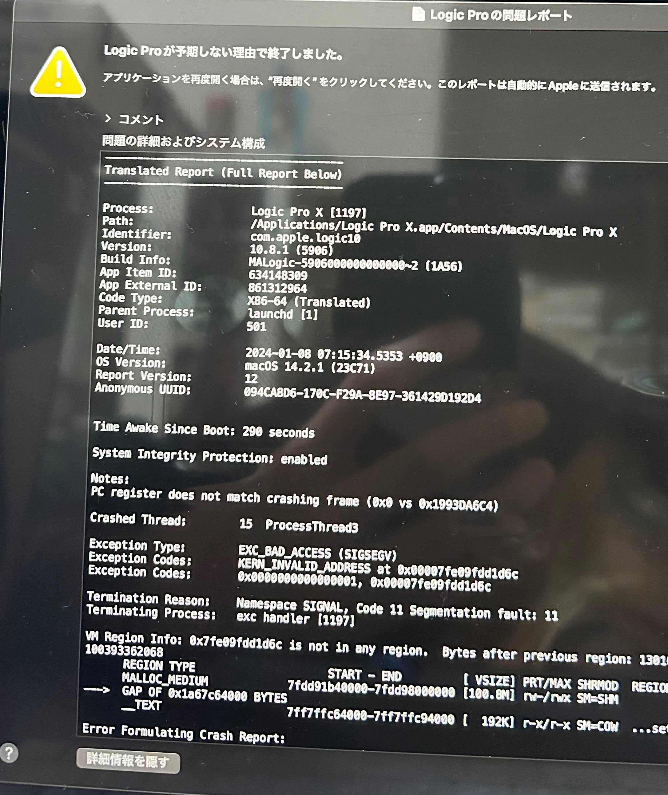 再度、アンインストールなどもしてみましたが、Logic自体が勝手に落ちてしまうので分かる方おりましたらお願いします。