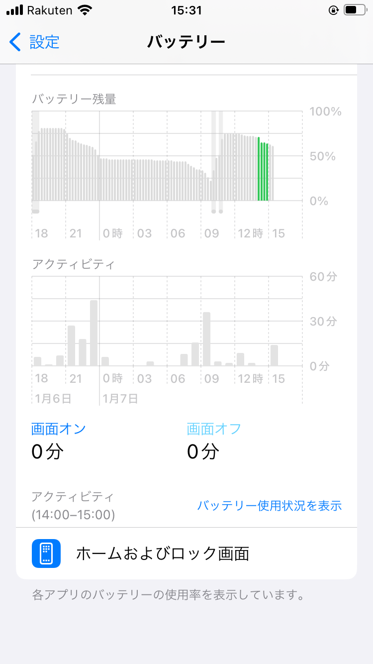 先程、バッテリーの使用状況を確認したら何も使用していないにも関わらず、画像のグラフ(緑部分の棒の1本目から2本目にかけて)のとおり、一瞬で7,8%くらい?