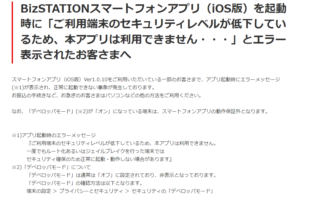 銀行系アプリが、「お使いの端末のセキュリティレベルが低下して…ご利用できません」といって落ちてしまう。