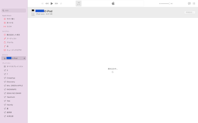 MacでiPod nano(第1世代)を同期させようと接続すると、FinderでiPodとしても外部ディスクとしても認識はされているのですが、iPodとして選択しても何も表示されません。ミュージックで開くと同期の画面で読み込み中になり先へ進めません。同期するにはどうしたら良いでしょうか?