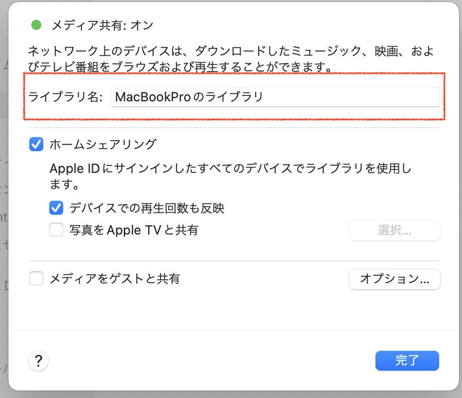 ミュージックライブラリもTVライブラリも共に他のコンピュータから共有するときはここで設定した同じ名前を使用します。