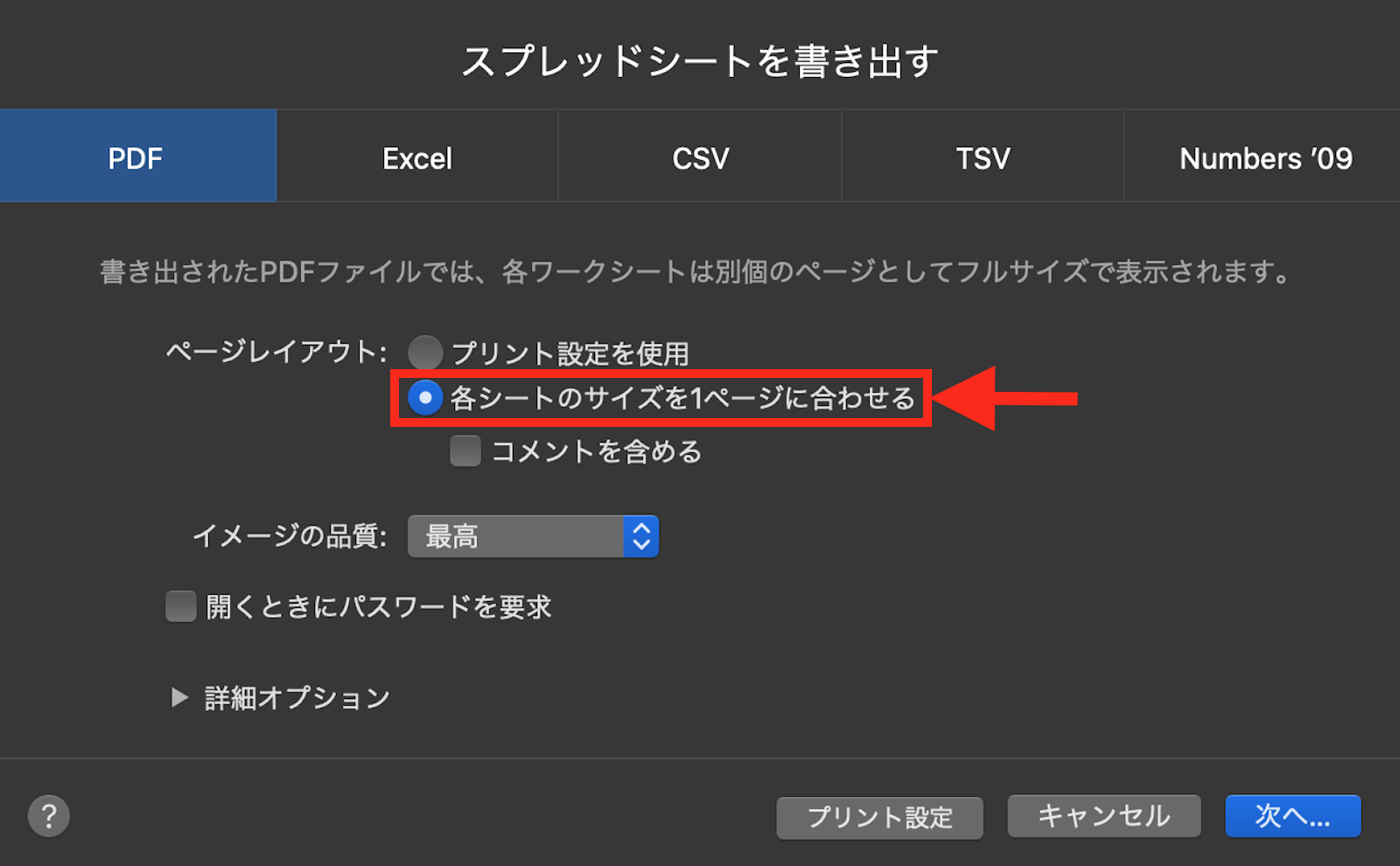「Numbers」のスプレッドシートを PDF で書き出す際に表示される、下の画像の様なプルダウンパネルで、「ページレイアウト」の項目はどの様に設定されていますでしょうか?