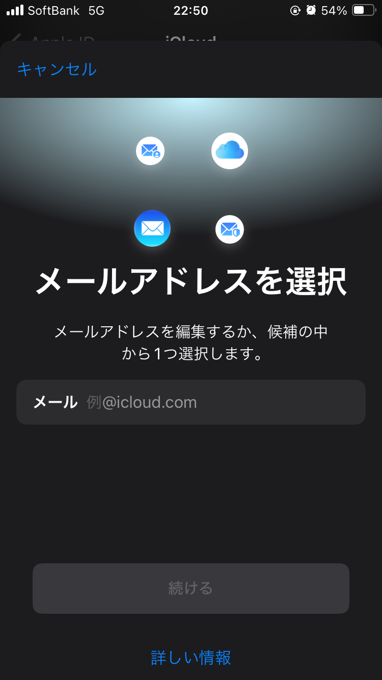 SEのiCloudメールの設定画面では候補のアドレスも表示されずこのiPhoneで使用という文言も出てきません。(スクショあり)