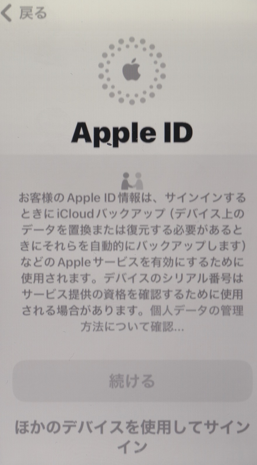 iPhoneSE2問題が出たので復元したのですが、設定中Apple IDのページが普通と少し違う様で トップの丸いアイコンは同じで、Apple ID説明がありその最後にApple ID情報の説明と”個人データ管理方法の確認...”と言う青いリンク。その下にグレーアウトされた”続ける”と書かれたボタン。最後に青い文字で”ほかのディバイスを使用してサインイン”と書かれたページが出てきます。個人データ管理方法の確認...と言う青いリンクは山のような説明へリンクされているだけ。他に押せる場所はページの左上に有る”戻る”だけでこの先にいけません。 どうしたら良いのでしょう?