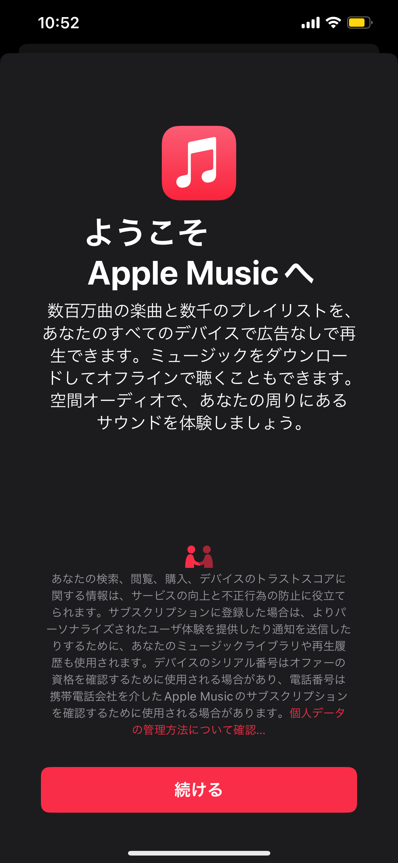 普段はiPodを使っていて久しぶりにiOSでmusic appを開いたら「apple musicへようこそ」のダイアログが出てキャンセルしたいけど選択肢が「続ける」しかありません。
