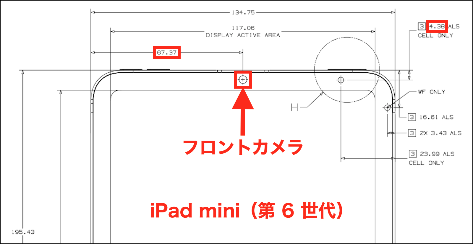 iPad mini(第 6 世代)の場合、フロントカメラは下の画像の様に、左端から 67.37 mm 、上端から 4.38 mm の位置になるかと思います。
