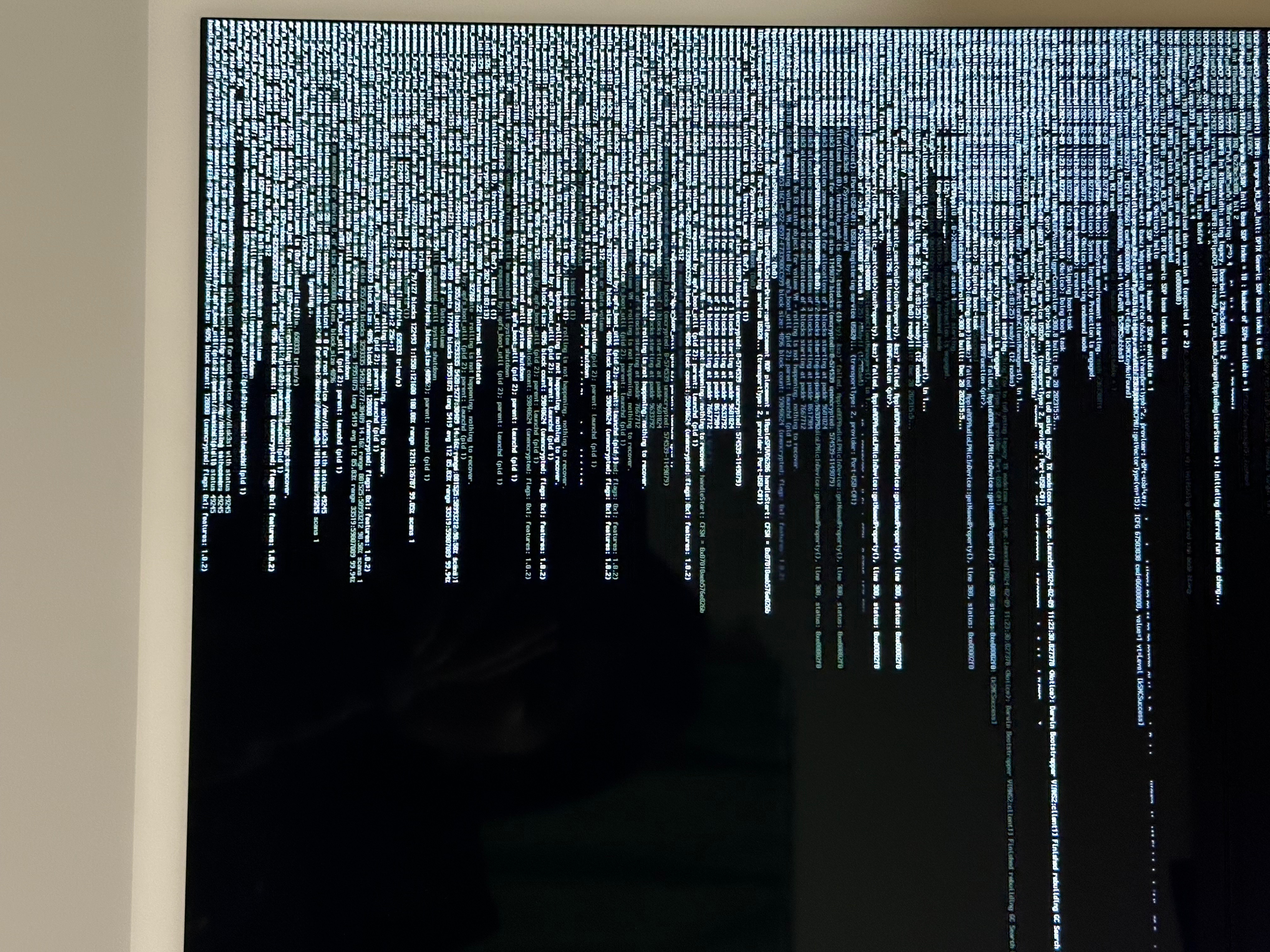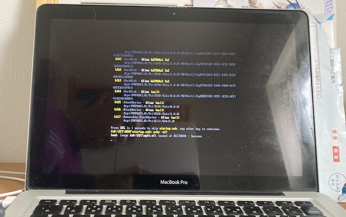 ・上記セーフモードでの起動を検証中にTimemachineのバックアップで復元を選択してしまい、数時間読み込みがされるものの進展がなく、強制終了→以後問題なく使えるものの、起動時に文字が出るようになった?