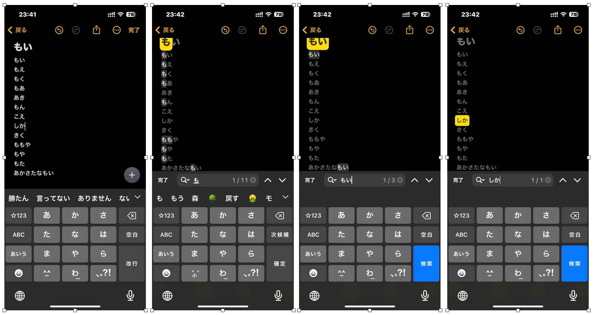 iOS17.3ですが、もえ、もん、もた全て検索できますね。