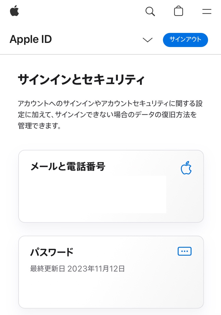 ①Apple アカウント - appleid.apple.com に Apple ID でサインイン>「メールと電話番号」>Apple IDのメールアドレスが表示されなければ「+」で追加する。