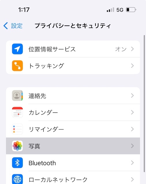 プライバシーとセキュリティの設定で、写真だけがタップしても設定画面に進みません。Bluetoothやリマインダーなど他のアプリの設定画面には進めます。