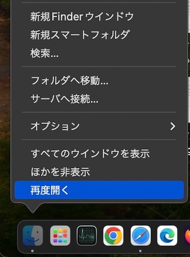 optionを押しながら、DockのFinderのアイコンを長押しタップすると出るプルダウン(プルアップ?)メニューにある、