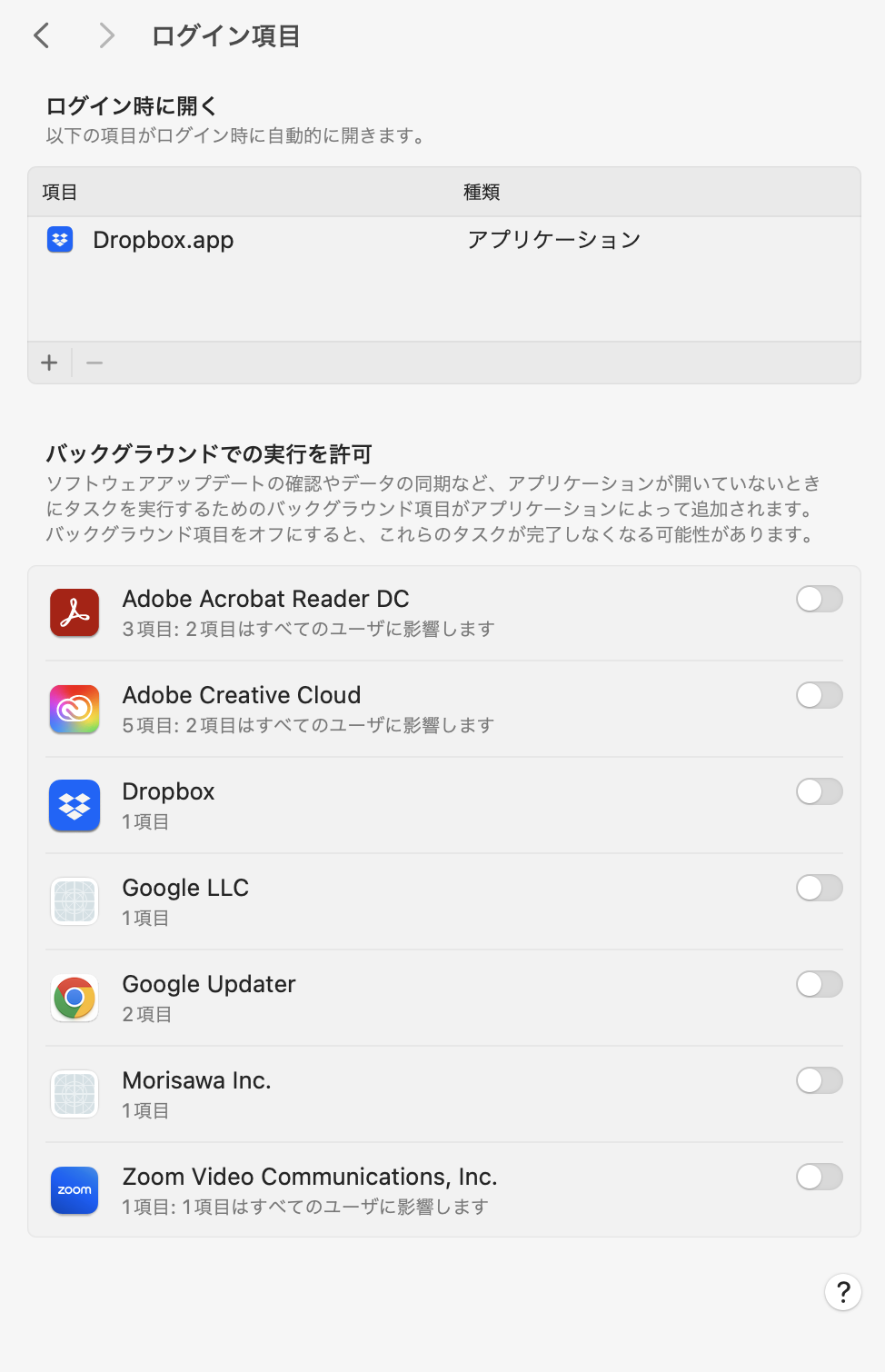スリープする前に開いたままになっているアプリケーションがあればそれはなんでしょうか。一週間ごとにアップデートがあるというと例えば Google Chrome とかですがご利用でしょうか。またログイン項目に何かないでしょうか。