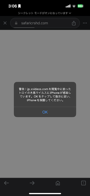 OKを押すと個人情報を搾取するページに飛ぶフィッシング詐欺か、AppStoreの役に立たないセキュリティアプリのページに飛んで、高額のアプリ代やサブスクリプション代を支払わせる本当の詐欺のページに飛ぶんじゃ無いですかね。