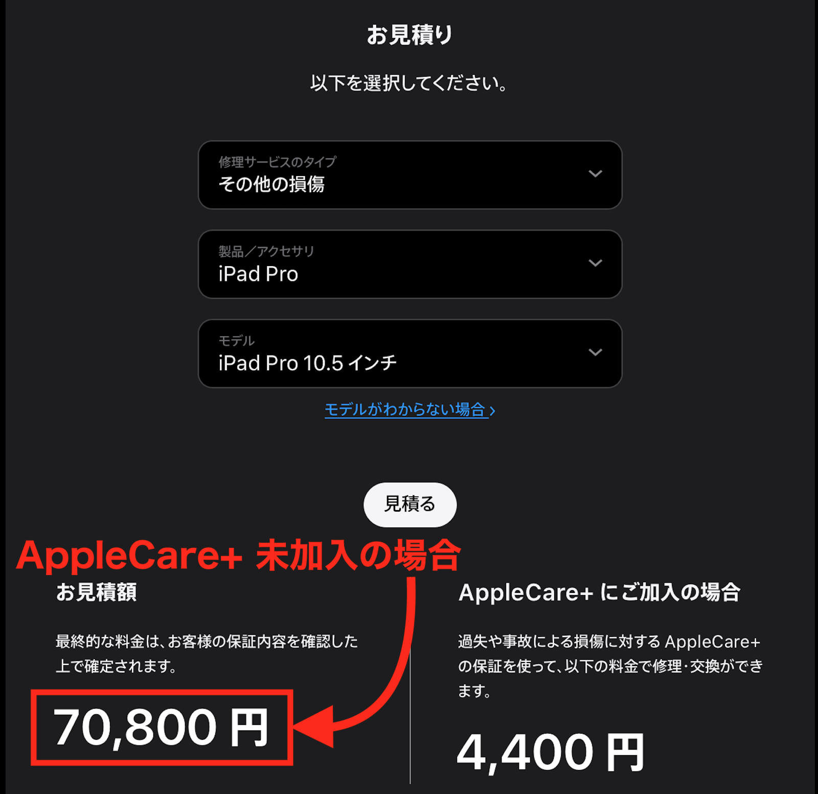 もし、AppleCare+ に未加入の場合、下記リンクのページで見積もりを取って見ると、下の画像の様に、かなり高額の修理サービス料金になりますので、AppleCare+ に加入されている場合は修理に出し、未加入の場合は新規購入も視野に入れて見ては如何でしょうか。