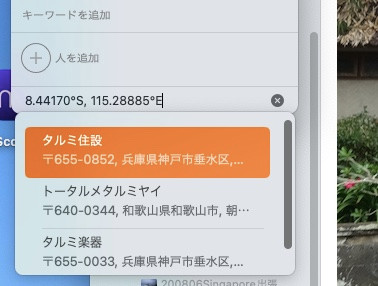 MacBookAirの「写真」アプリで、「位置情報を割り当てる」ところに、緯度経度を入力すると、ぜんぜん別の場所になります。