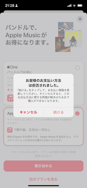 ギフトカードで Apple Music に登録しようとしても支払いができない