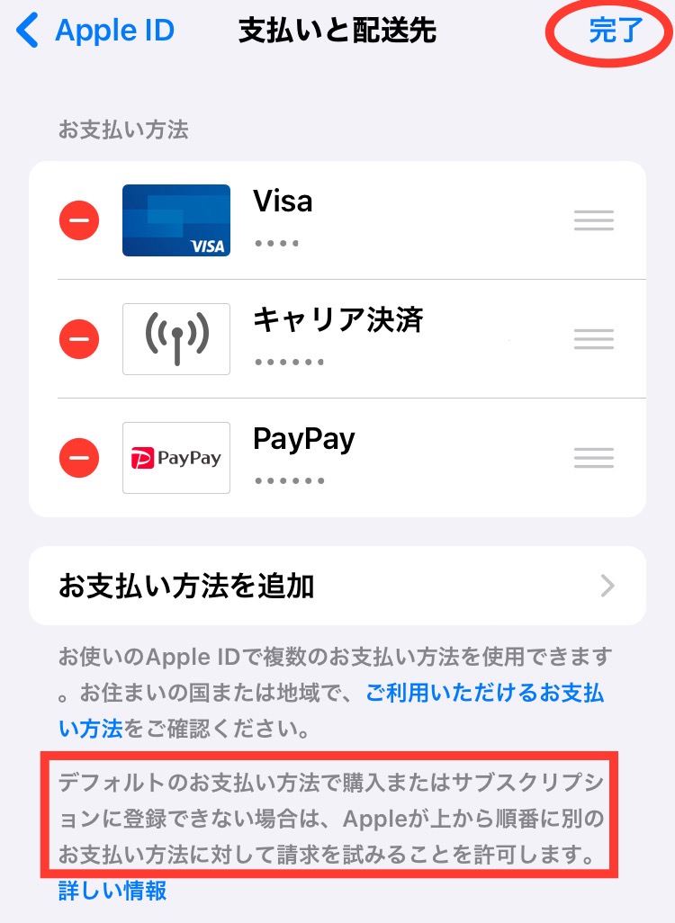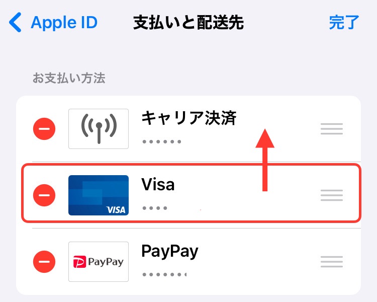 クレジットカード(またはPayPayなど)を新しくお支払い方法に追加した場合、画面右上の「編集」>「クレジットカード(またはPayPayなど)」をドラッグしながら「キャリア決済」より上段に移動>「完了」。