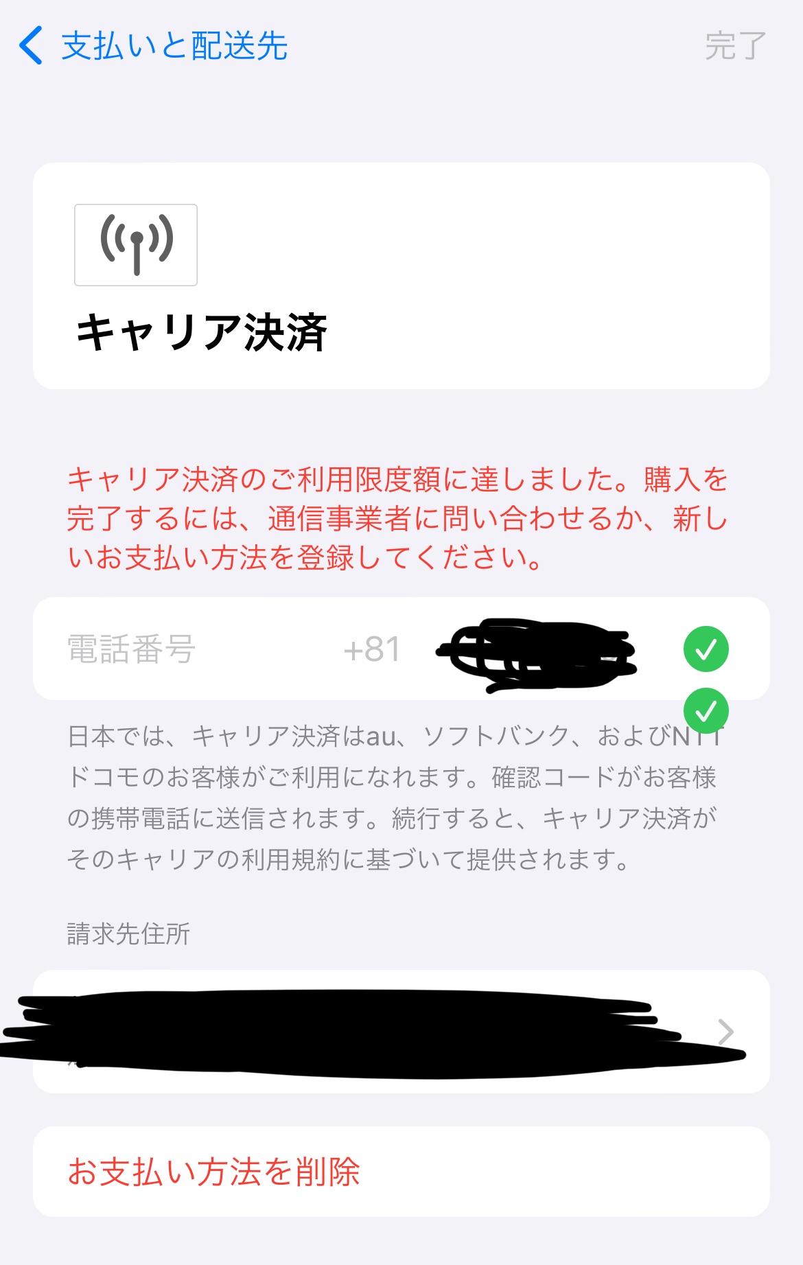 自身で限度額の設定変更できるケースもありますので、「○○○(キャリア名) キャリア決済限度額」で検索し確認しましょう。