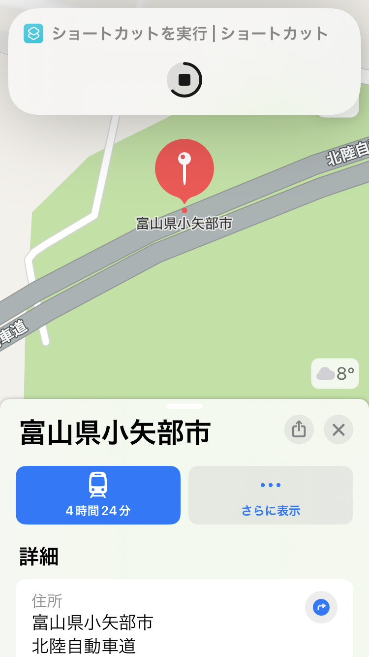 ショートカットアプリを開き、アプリ内から実行すると問題なくマップは最前面で表示されます