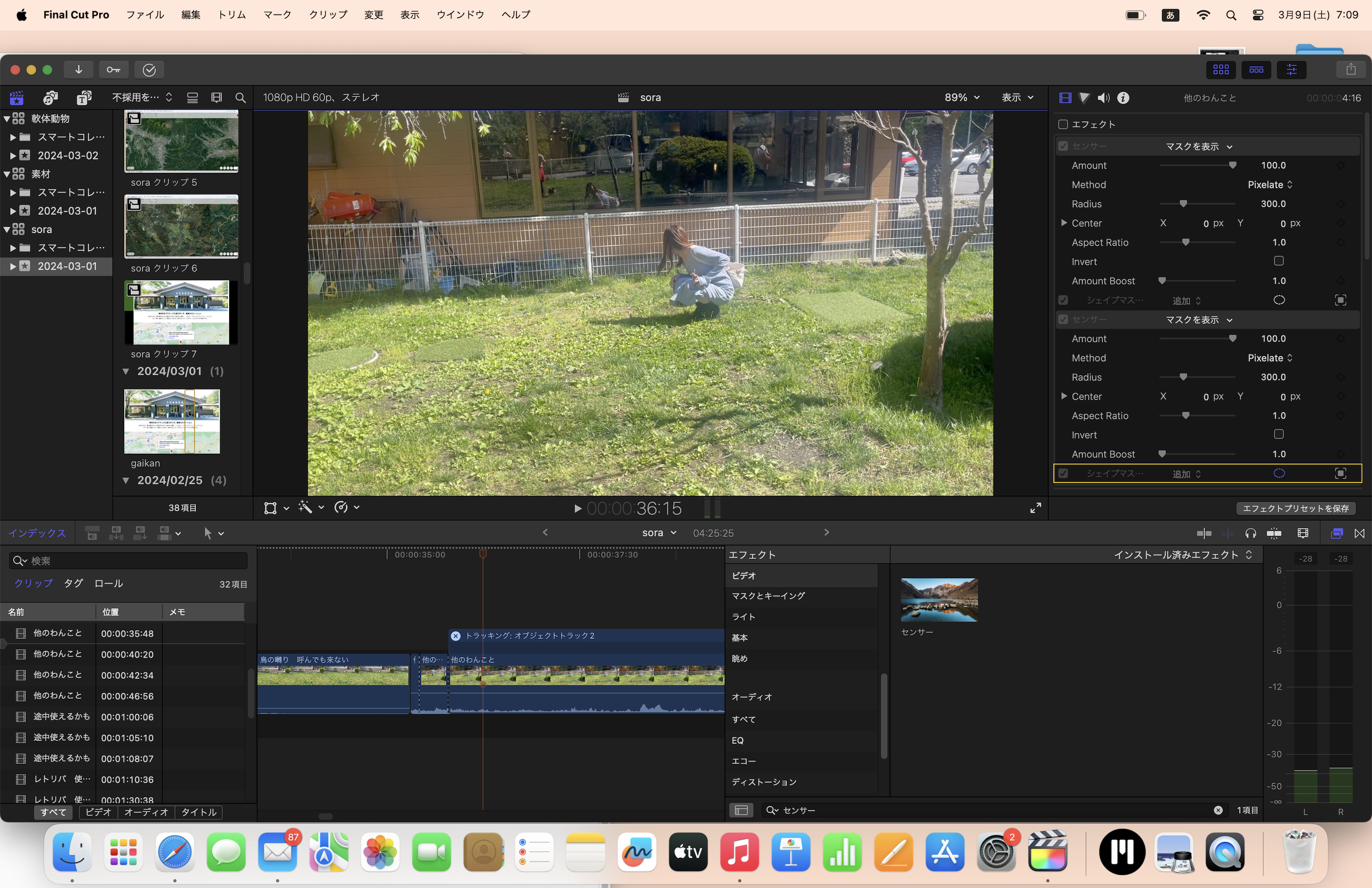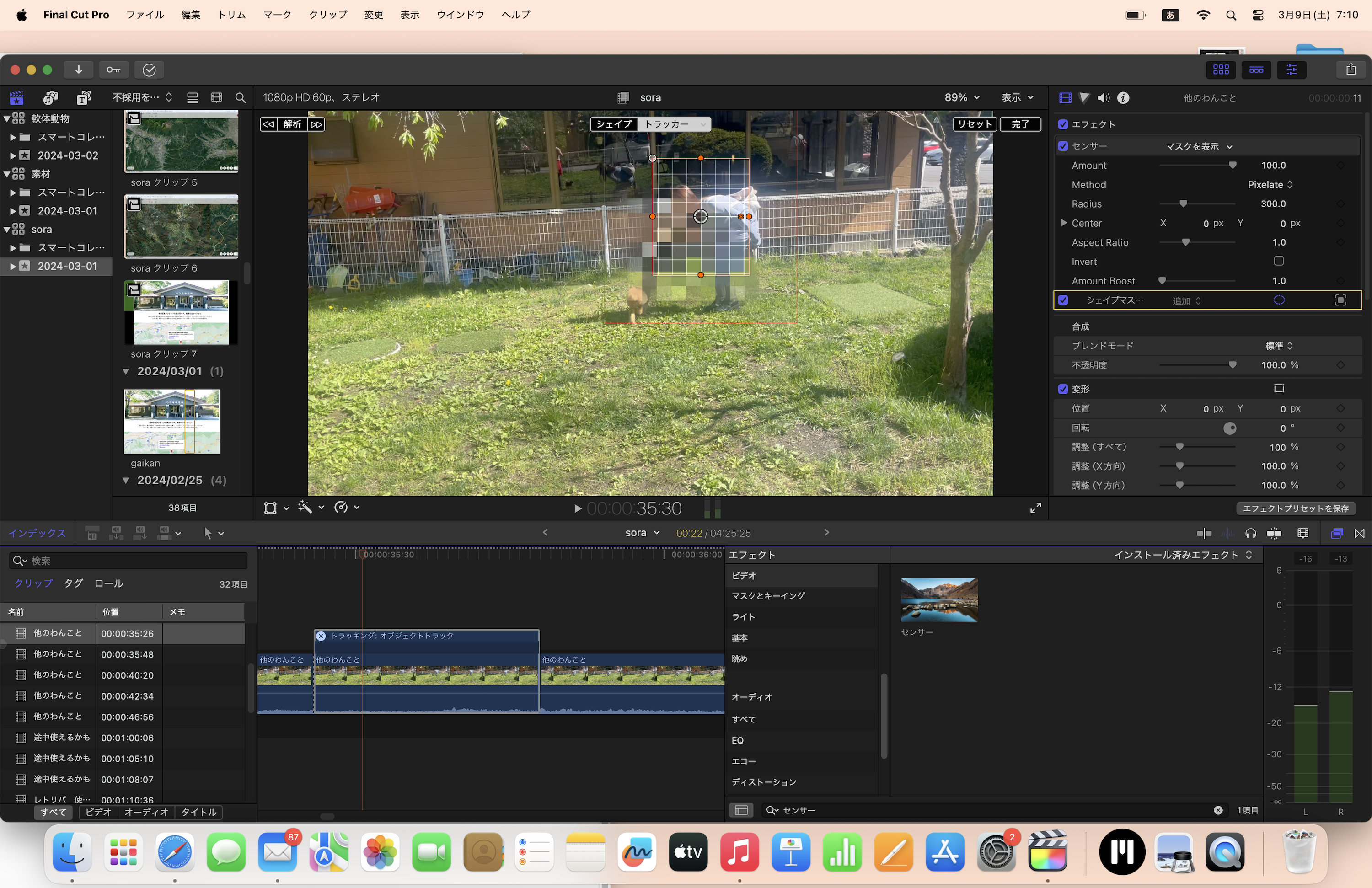 ・センサーが適用できるクリップと出来ないクリップを、右クリックにて「新規複合クリップ」にしてしまえば、反映させられなかった箇所にも反映させられます。ただ、この後映ってくる人数が多かったり、モザイクの中に犬が高速で走り込んだ来てモザイクが移ってしまったりするので、クリップを分けてセンサーを適用したかったのです。(ご指摘のことをすれば解決するかもしれませんね!)